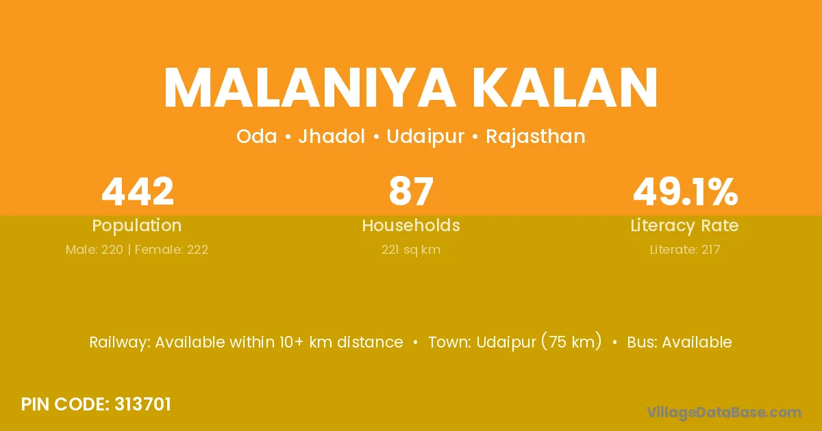 Udaipur (75 km) is the nearest town to Malaniya Kalan village for major economic activities and is located approximately 75 km away.
