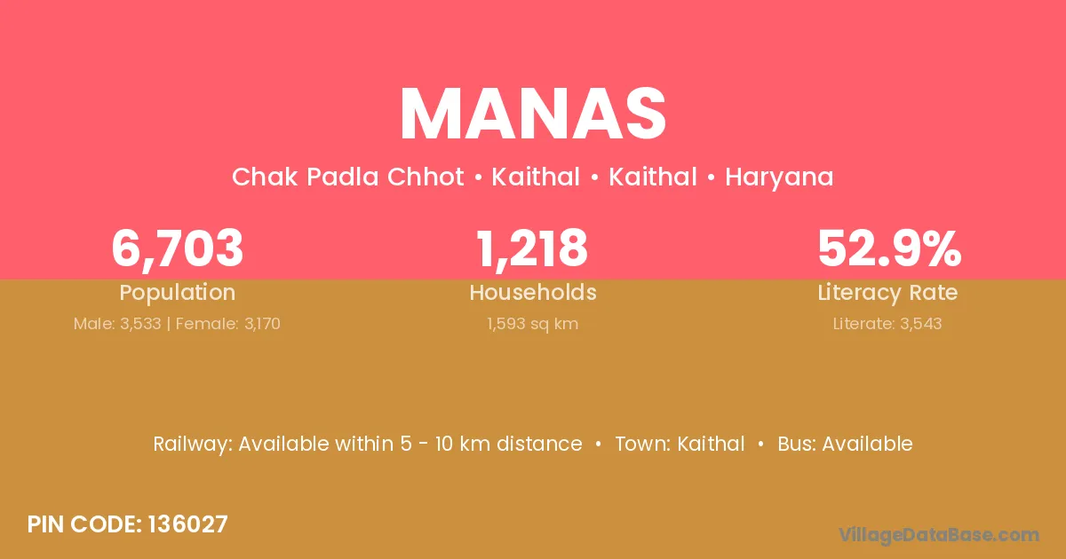 The literacy rate of Manas village is 42.60%. Male literacy stands at 51.85% and female literacy at 33.36%.