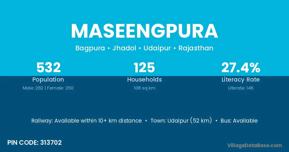 Udaipur (52 km) is the nearest town to Maseengpura village for major economic activities and is located approximately 52 km away.
