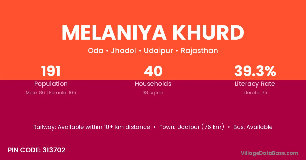 Udaipur (76 km) is the nearest town to Melaniya Khurd village for major economic activities and is located approximately 76 km away.
