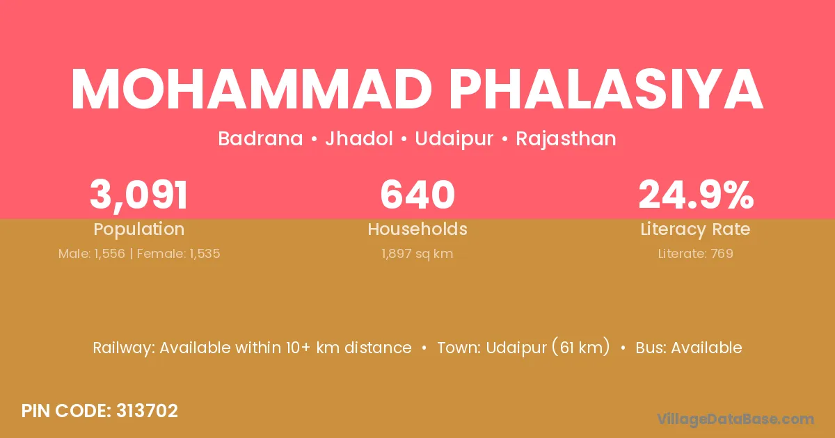 Udaipur (61 km) is the nearest town to Mohammad Phalasiya village for major economic activities and is located approximately 61 km away.