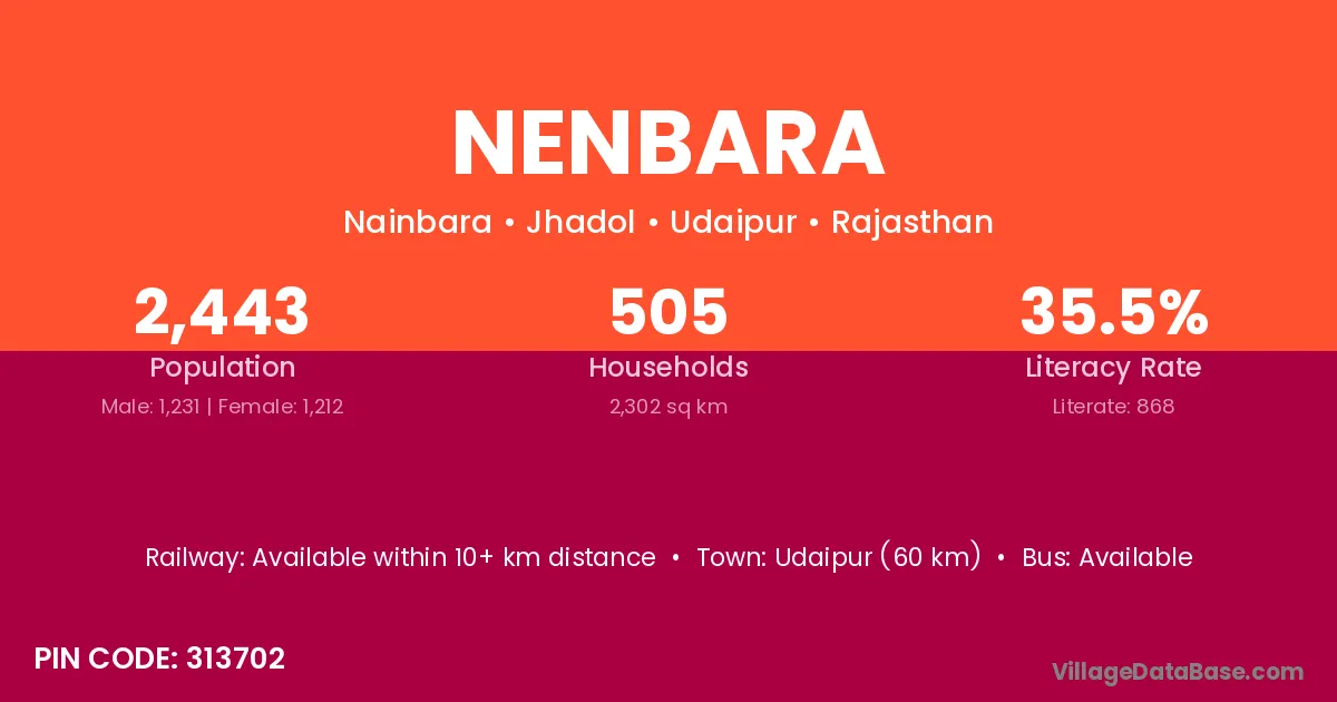 Nenbara village is located in the Jhadol Tehsil of the Udaipur district in Rajasthan .