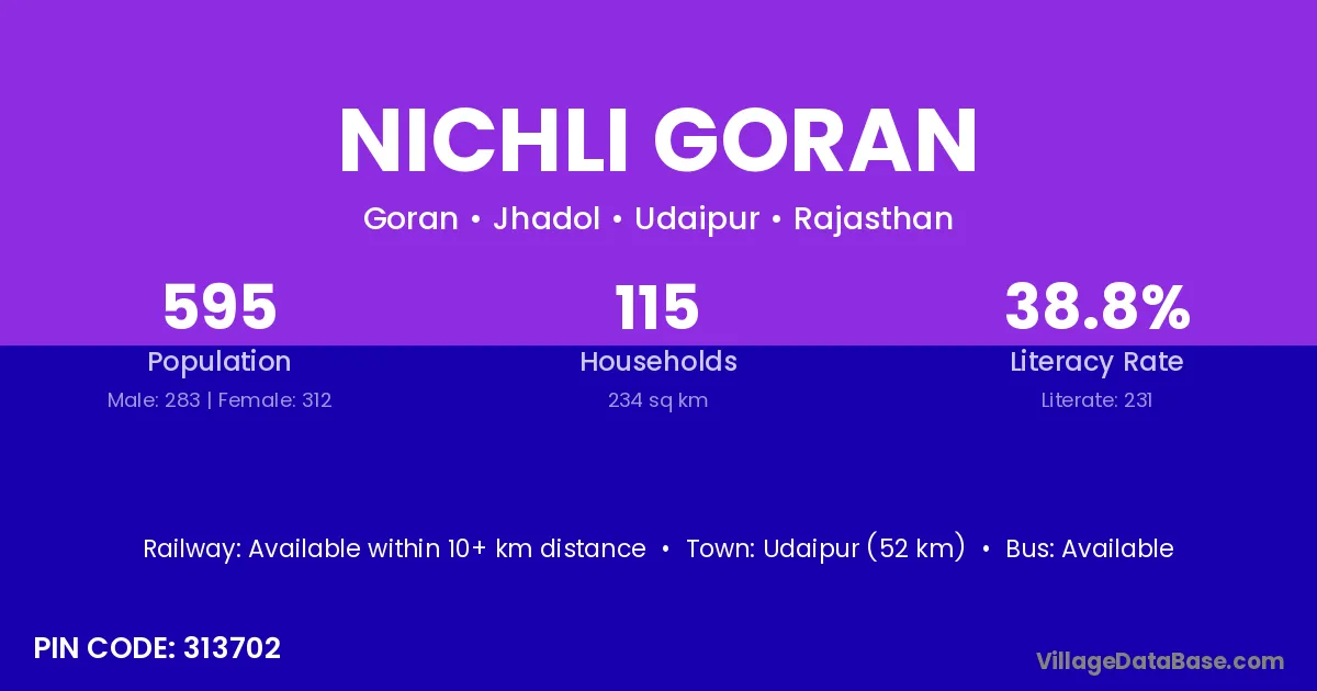 Udaipur (52 km) is the nearest town to Nichli Goran village for major economic activities and is located approximately 52 km away.