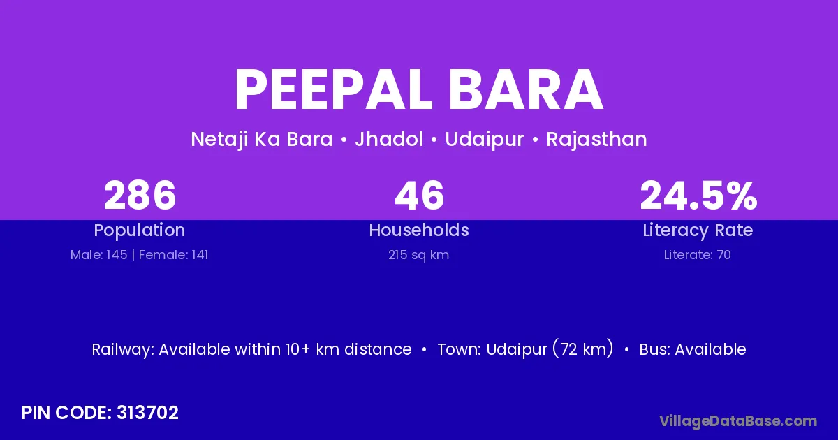 Udaipur (72 km) is the nearest town to Peepal Bara village for major economic activities and is located approximately 72 km away.