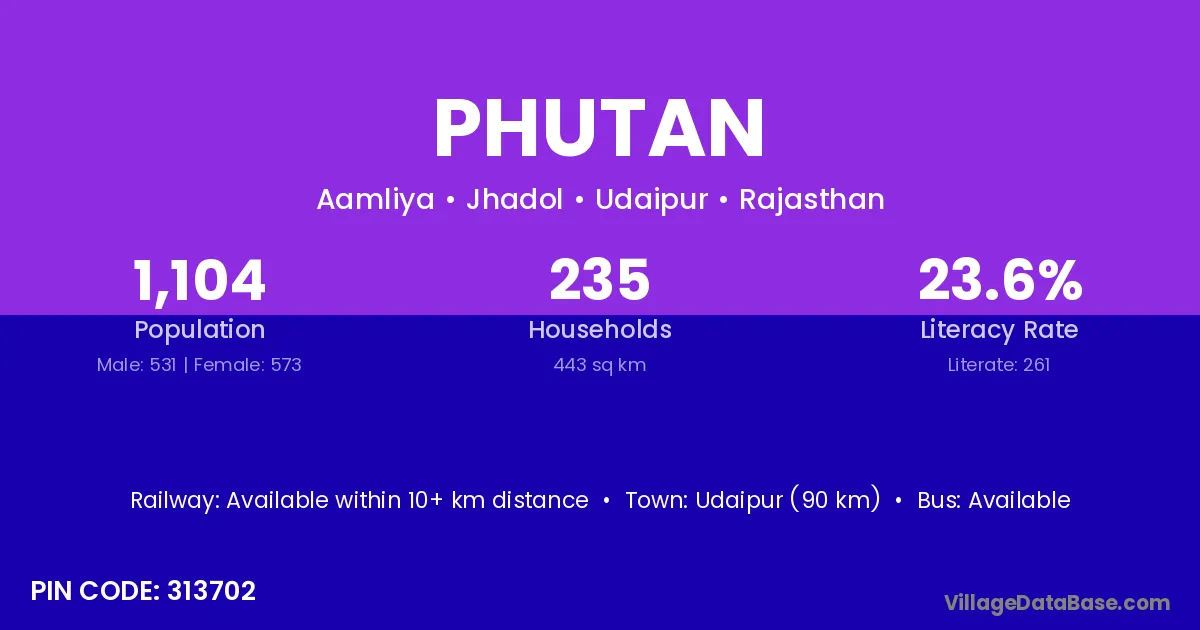 Udaipur (90 km) is the nearest town to Phutan village for major economic activities and is located approximately 90 km away.