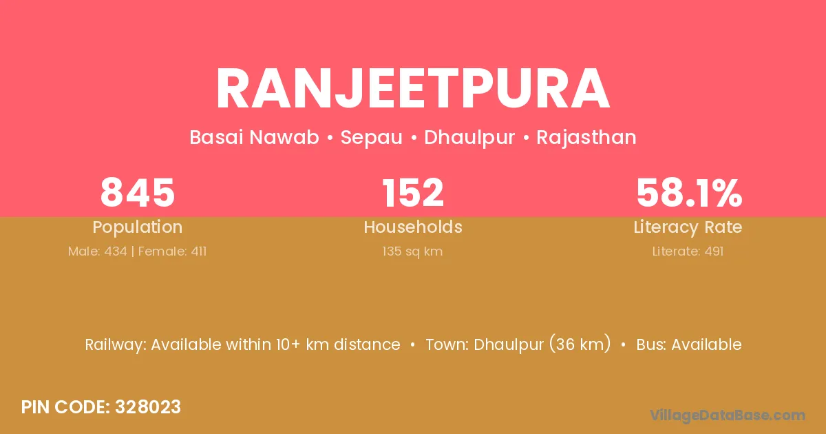 Ranjeetpura village has a total population of 276 people, of which 144 are males and 132 are females.