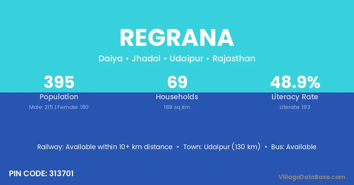 Udaipur (130 km) is the nearest town to Regrana village for major economic activities and is located approximately 130 km away.