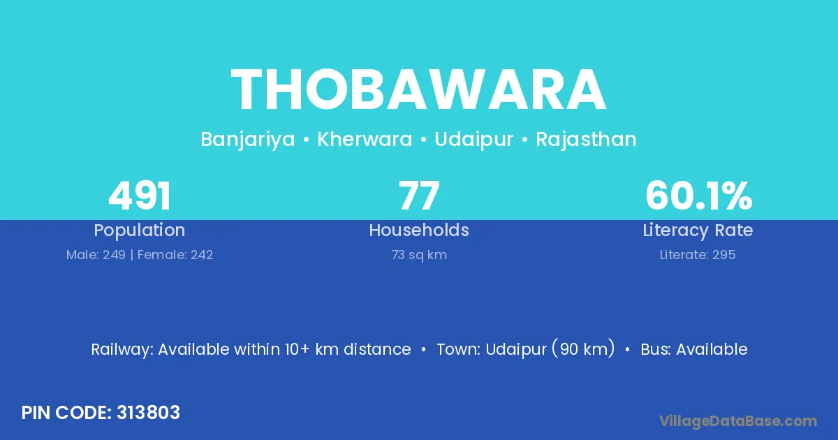 Udaipur (70 km) is the nearest town to Thobawara village for major economic activities and is located approximately 70 km away.