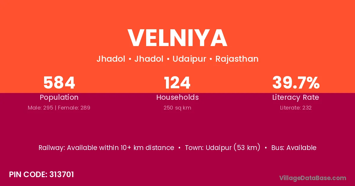 Velniya village has a total population of 584 people, of which 295 are males and 289 are females.