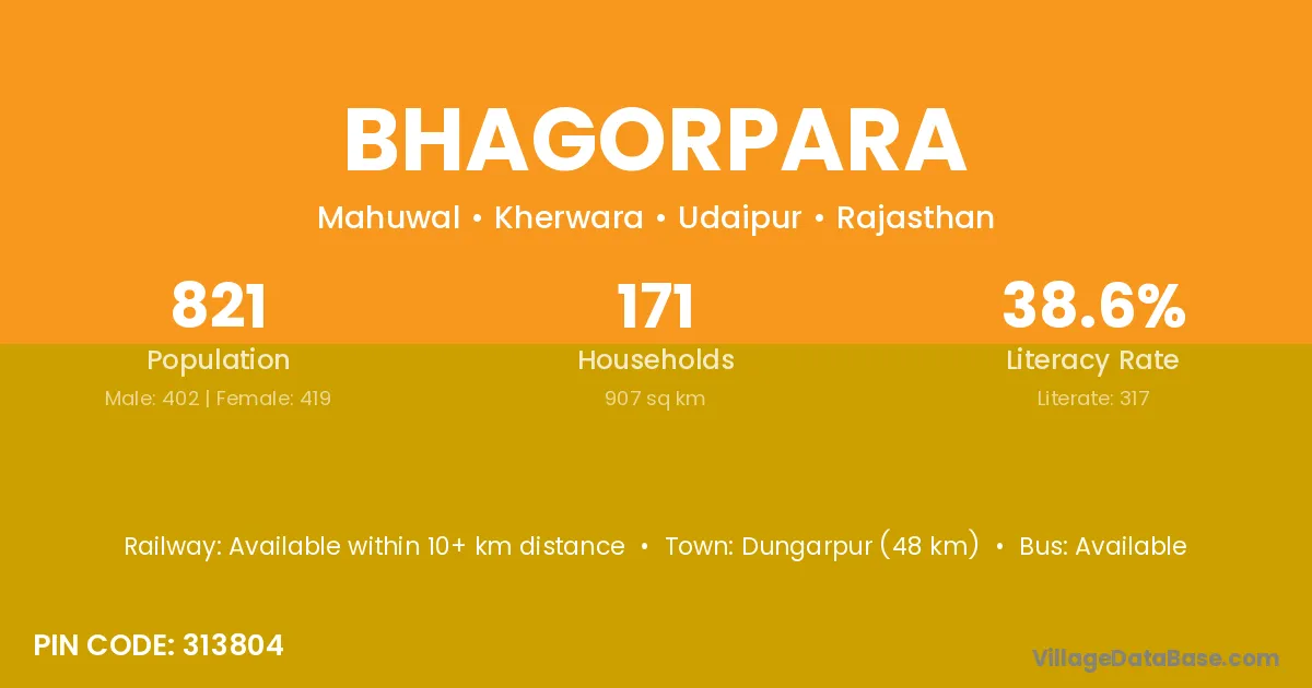 Dungarpur (48 km) is the nearest town to Bhagorpara village for major economic activities and is located approximately 48 km away.