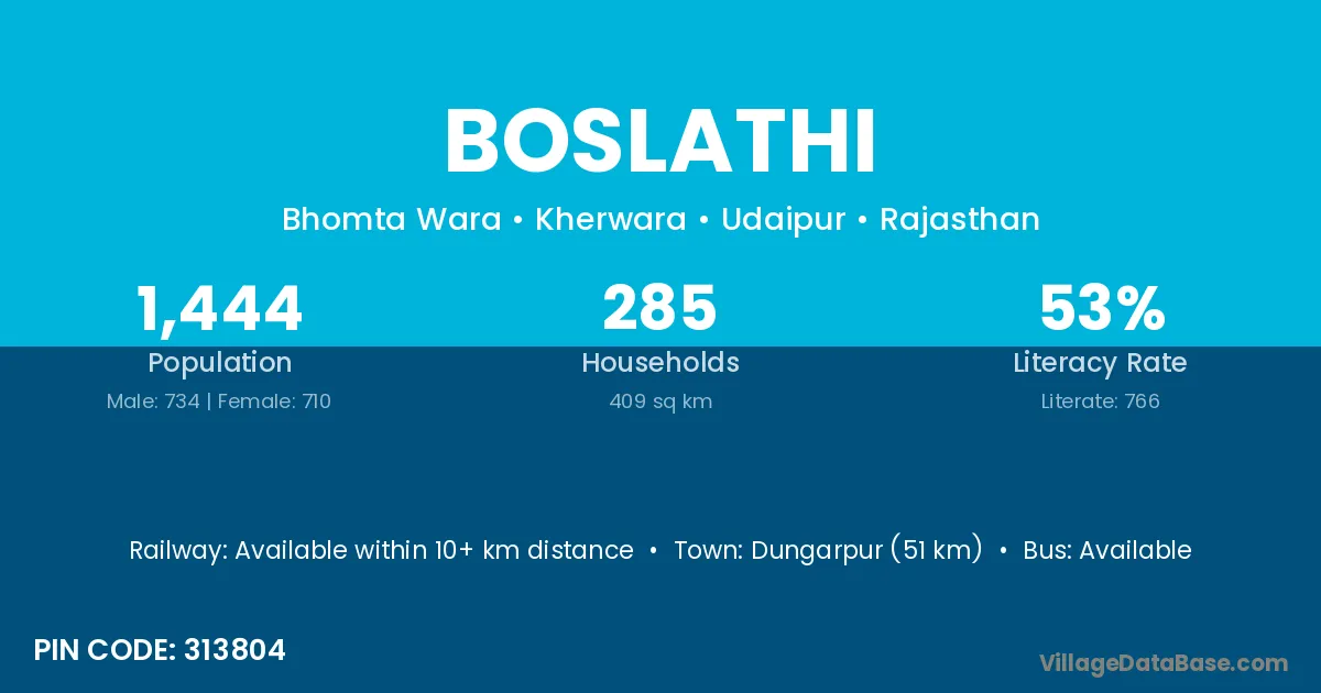 Dungarpur (51 km) is the nearest town to Boslathi village for major economic activities and is located approximately 51 km away.
