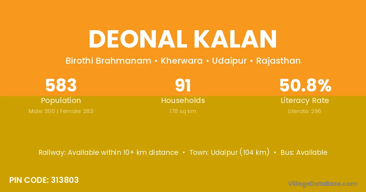 Udaipur (104 km) is the nearest town to Deonal Kalan village for major economic activities and is located approximately 104 km away.