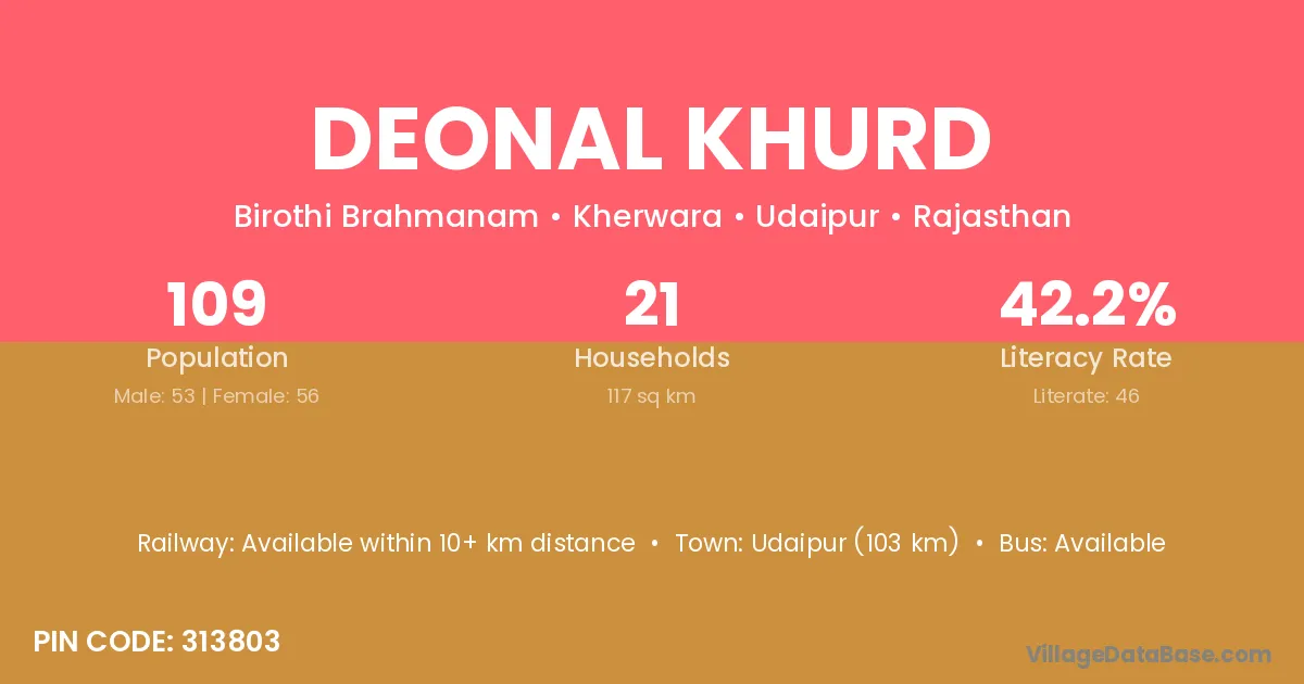 Deonal Khurd village has a total population of 109 people, of which 53 are males and 56 are females.