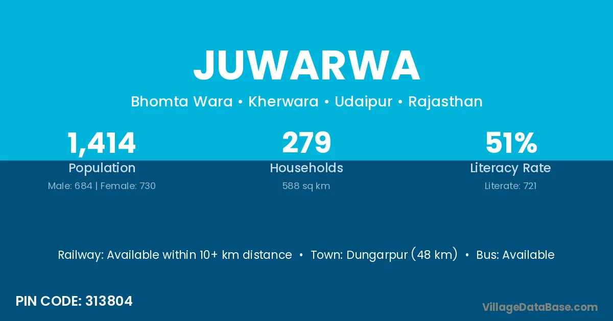 Dungarpur (48 km) is the nearest town to Juwarwa village for major economic activities and is located approximately 48 km away.