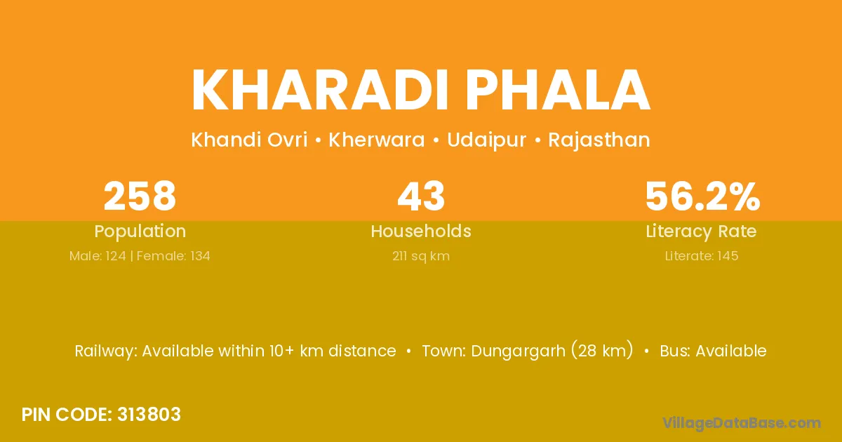 Dungargarh (28 km) is the nearest town to Kharadi Phala village for major economic activities and is located approximately 28 km away.