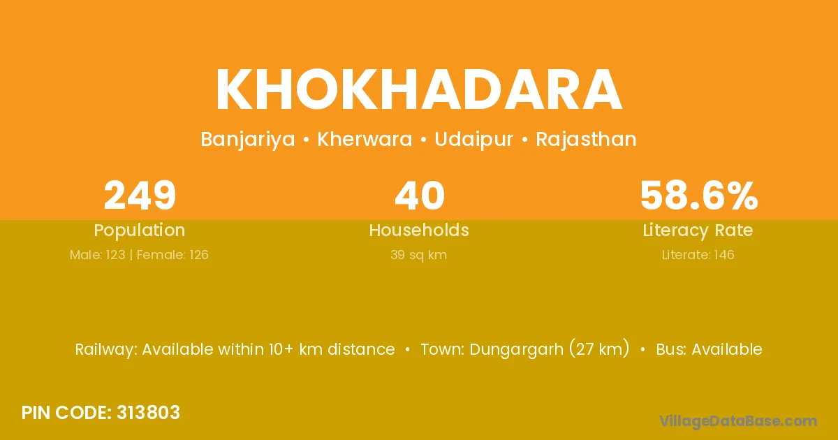 Khokhadara village has a total population of 249 people, of which 123 are males and 126 are females.