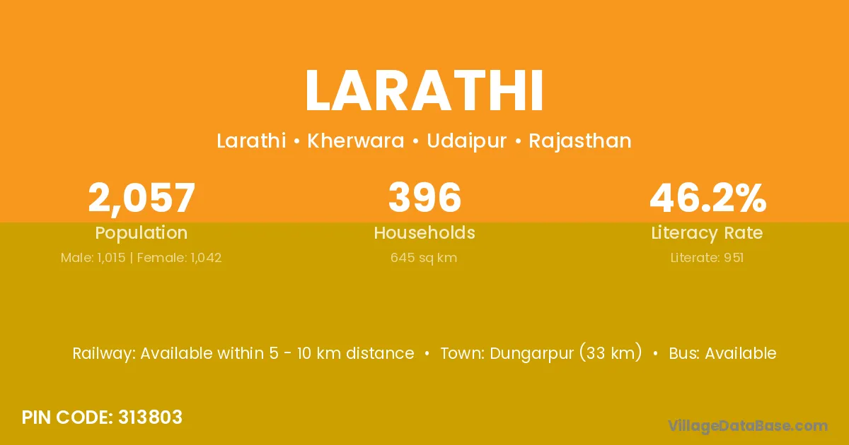 Dungarpur (33 km) is the nearest town to Larathi village for major economic activities and is located approximately 33 km away.