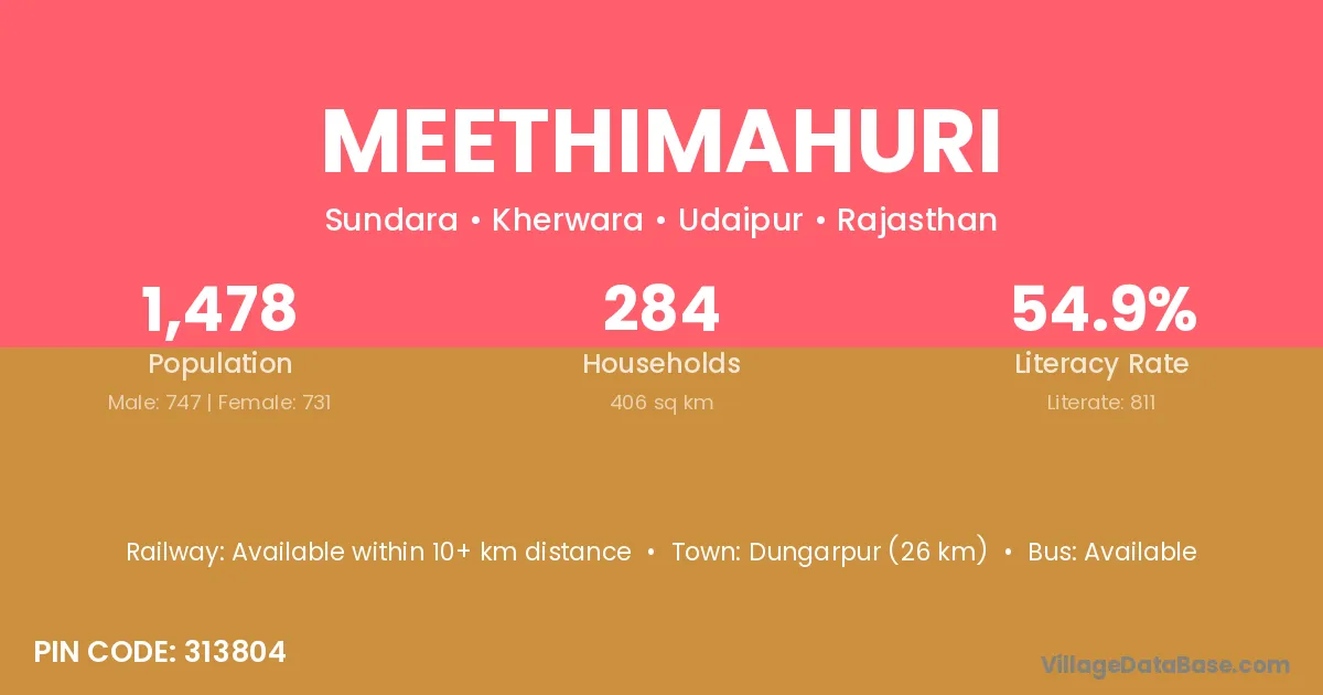 Dungarpur (26 km) is the nearest town to Meethimahuri village for major economic activities and is located approximately 26 km away.