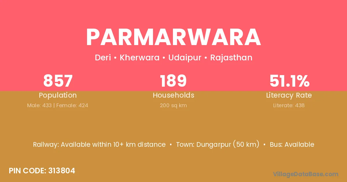 Dungarpur (50 km) is the nearest town to Parmarwara village for major economic activities and is located approximately 50 km away.