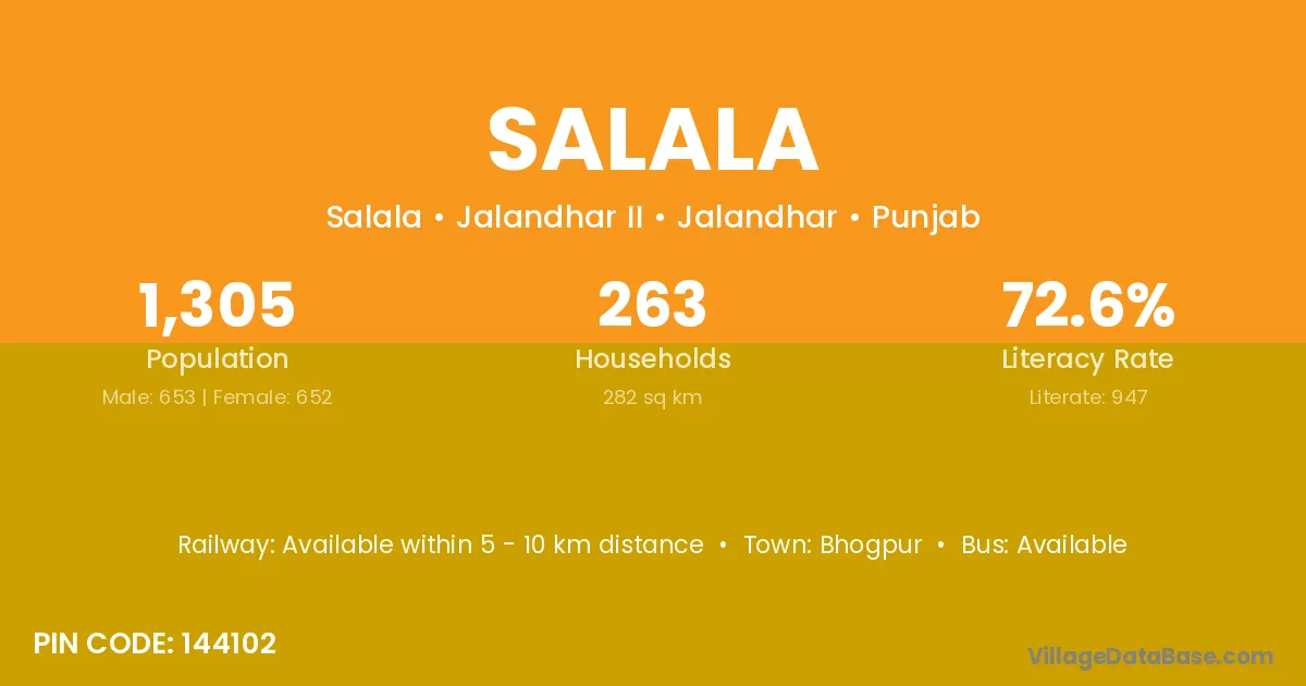 The literacy rate of Salala village is 50.98%. Male literacy stands at 68.12% and female literacy at 34.05%.