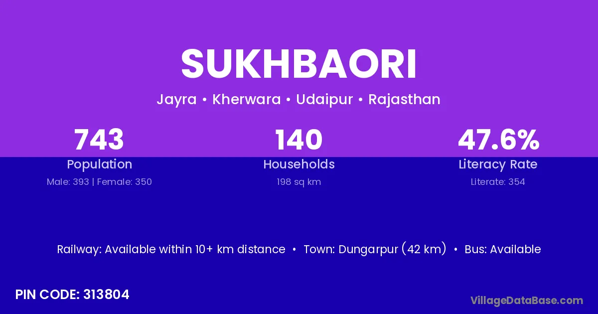 Dungarpur (42 km) is the nearest town to Sukhbaori village for major economic activities and is located approximately 42 km away.