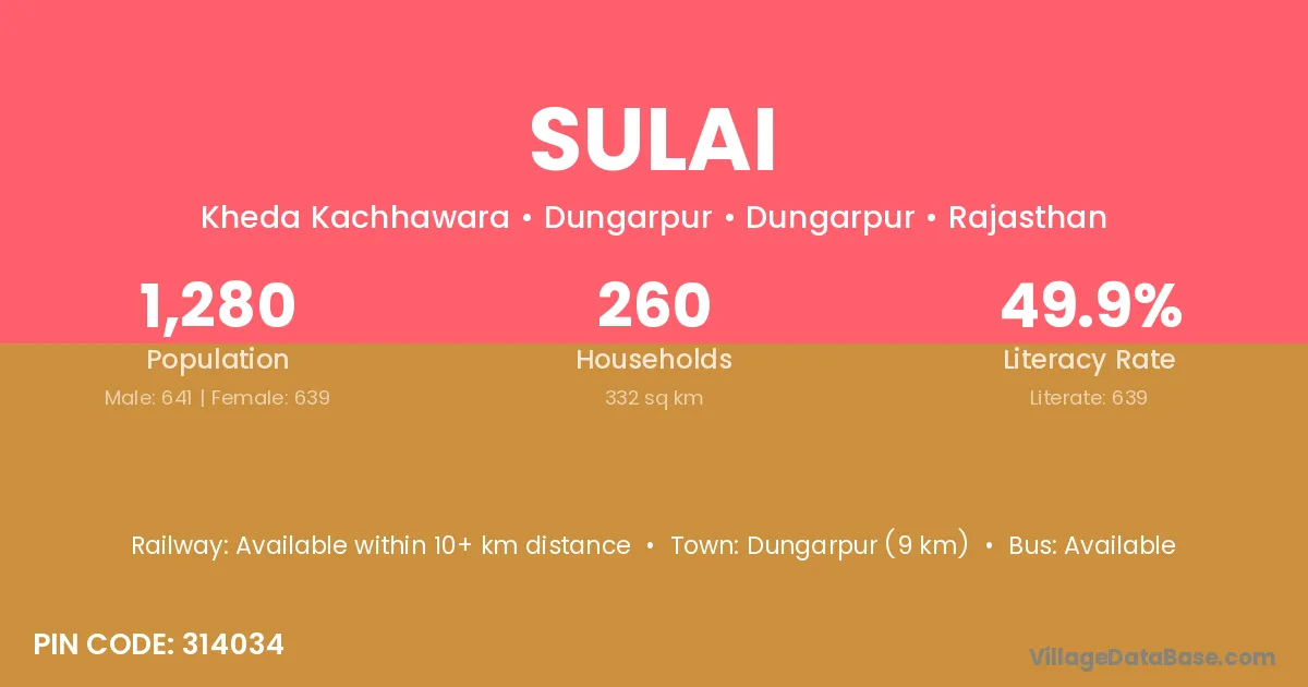 Udaipur (101 km) is the nearest town to Sulai village for major economic activities and is located approximately 101 km away.