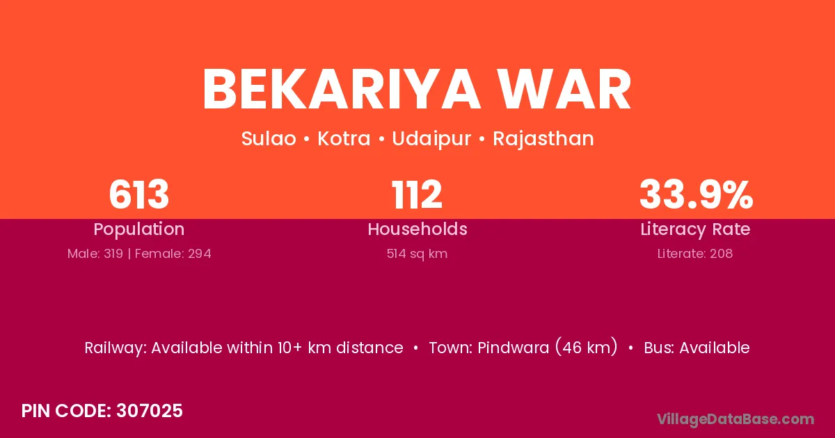 Pindwara (46 km) is the nearest town to Bekariya War village for major economic activities and is located approximately 46 km away.