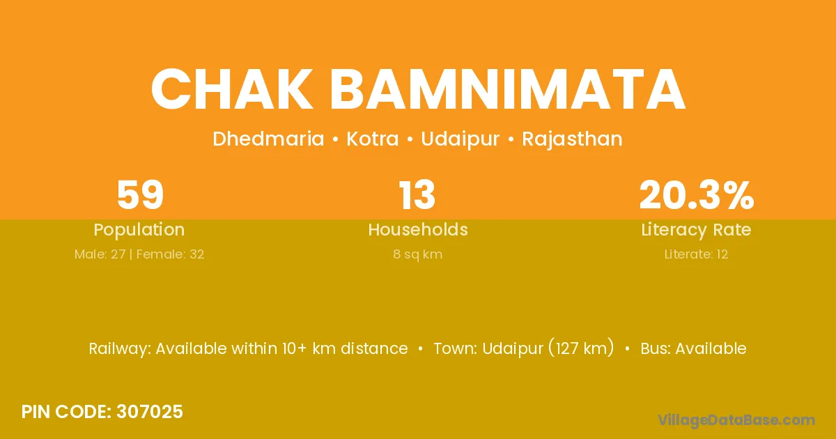 Udaipur (127 km) is the nearest town to Chak Bamnimata village for major economic activities and is located approximately 127 km away.