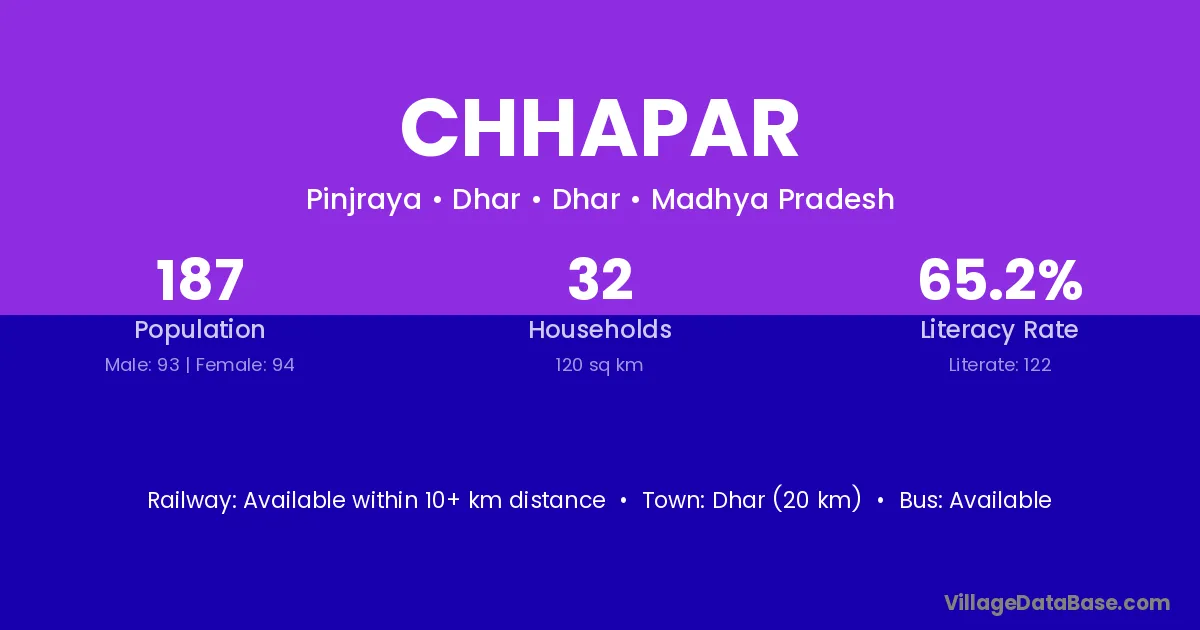 The literacy rate of Chhapar village is 14.96%. Male literacy stands at 24.04% and female literacy at 5.65%.