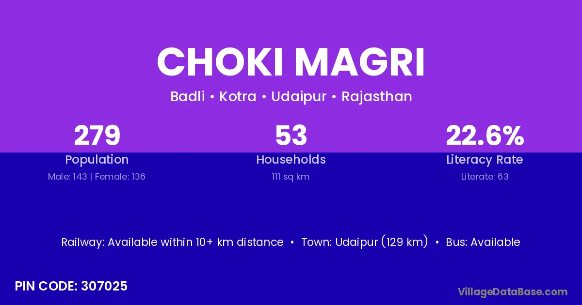 Choki Magri village has a total population of 279 people, of which 143 are males and 136 are females.