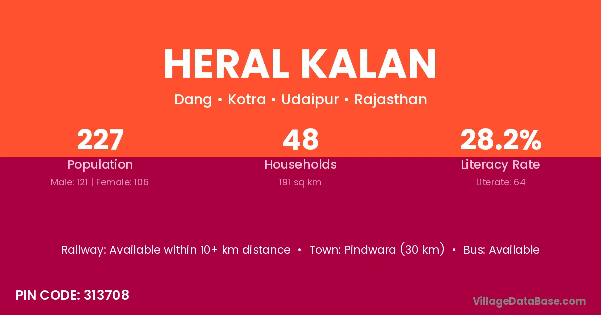 Pindwara (30 km) is the nearest town to Heral Kalan village for major economic activities and is located approximately 30 km away.