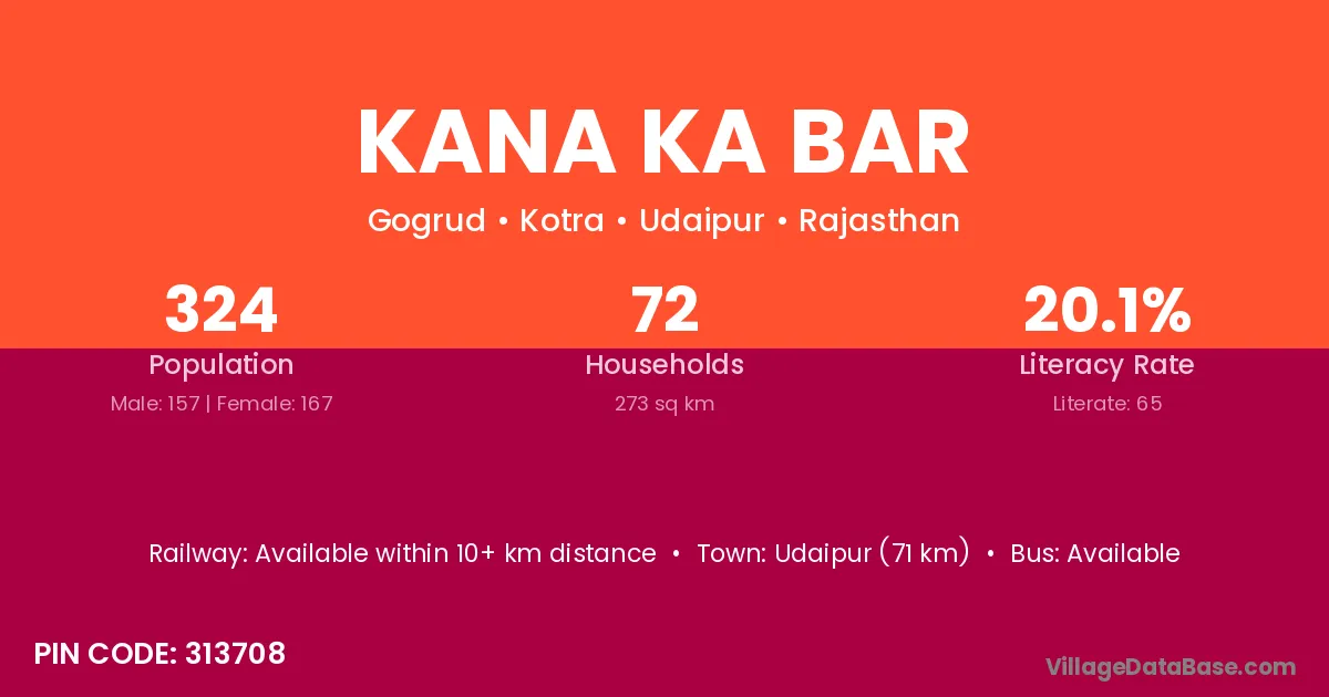 Udaipur (71 km) is the nearest town to Kana Ka Bar village for major economic activities and is located approximately 71 km away.