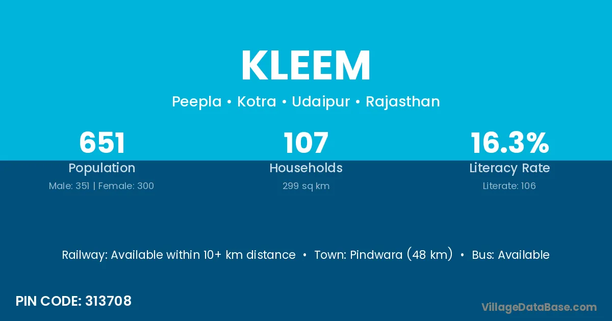 Pindwara (48 km) is the nearest town to Kleem village for major economic activities and is located approximately 48 km away.