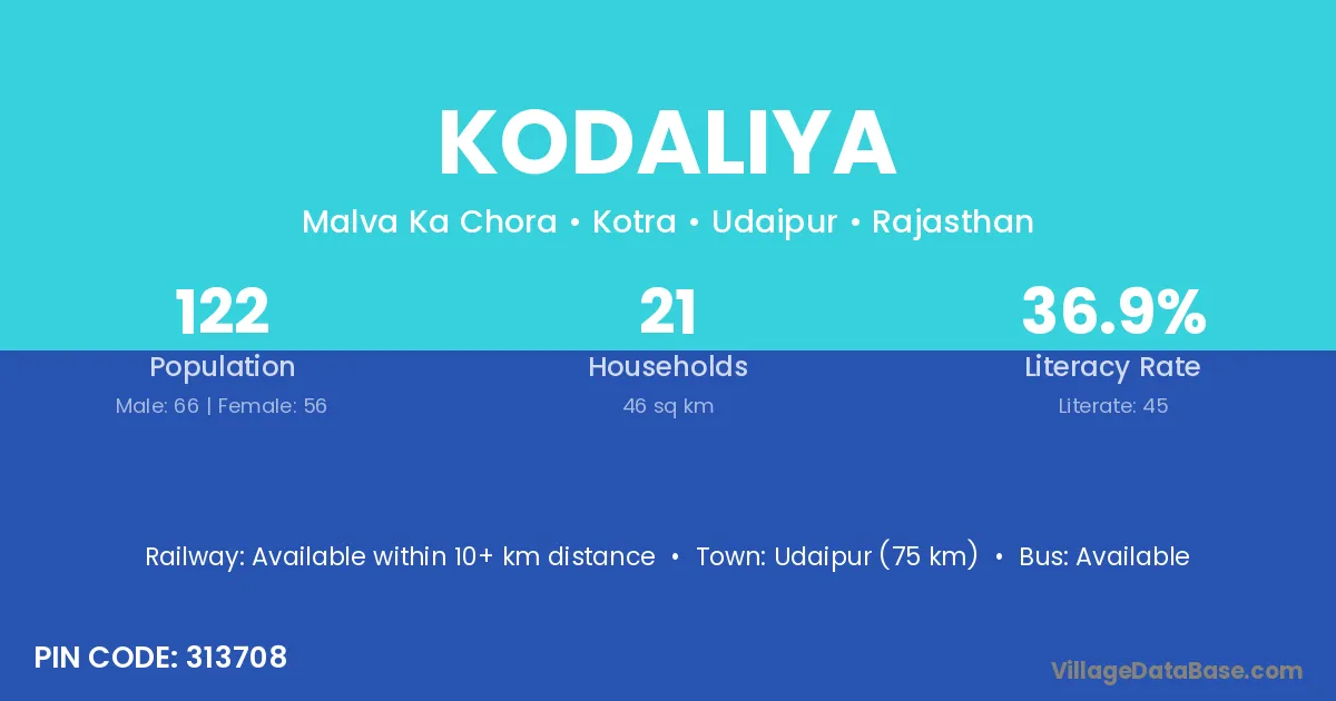 Udaipur (75 km) is the nearest town to Kodaliya village for major economic activities and is located approximately 75 km away.