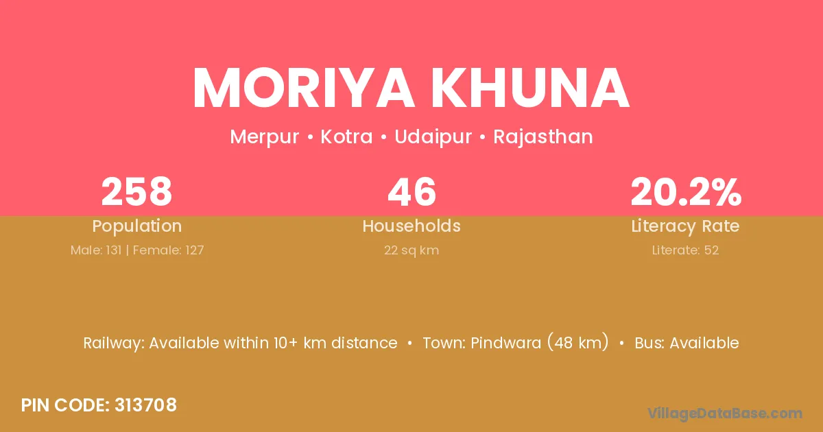 Pindwara (48 km) is the nearest town to Moriya Khuna village for major economic activities and is located approximately 48 km away.