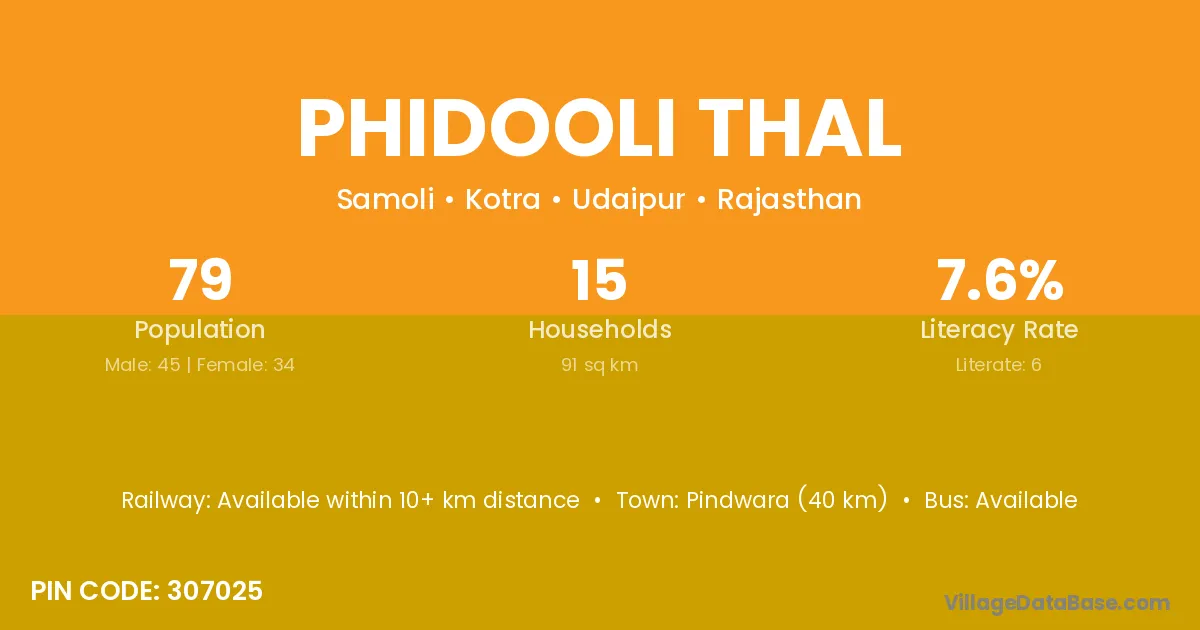 Pindwara (40 km) is the nearest town to Phidooli Thal village for major economic activities and is located approximately 40 km away.
