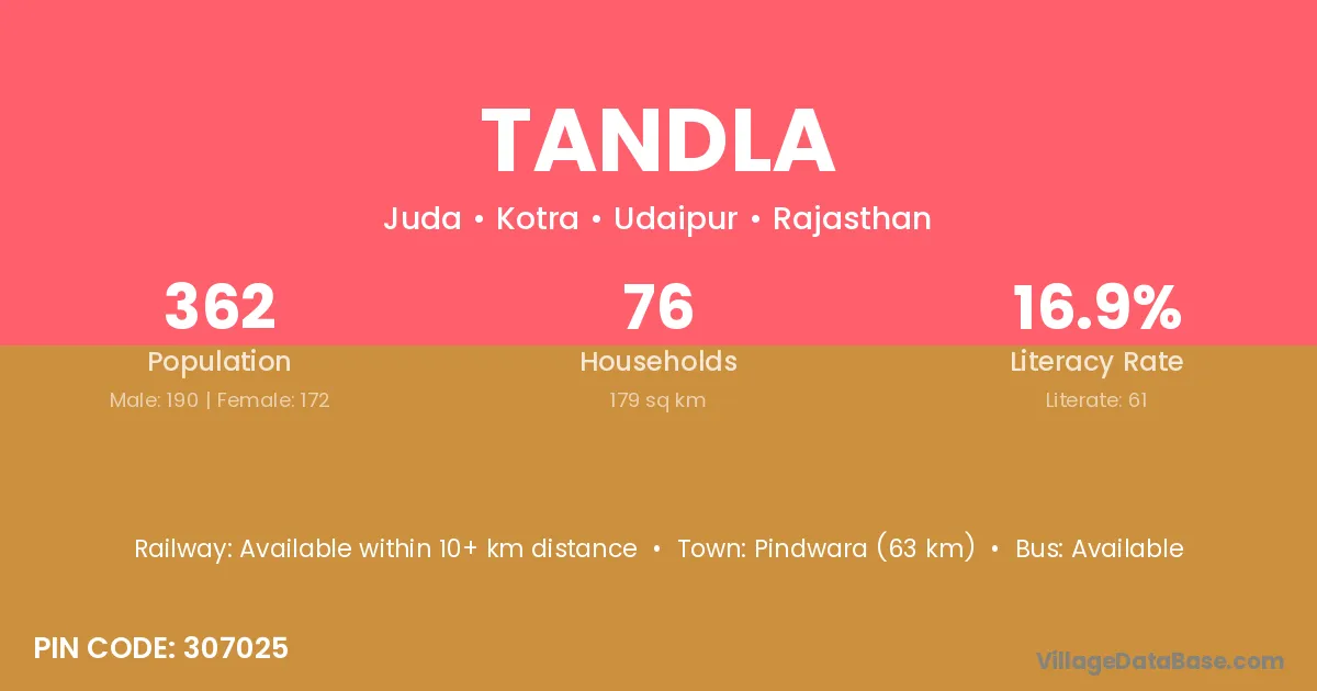 Pindwara (63 km) is the nearest town to Tandla village for major economic activities and is located approximately 63 km away.