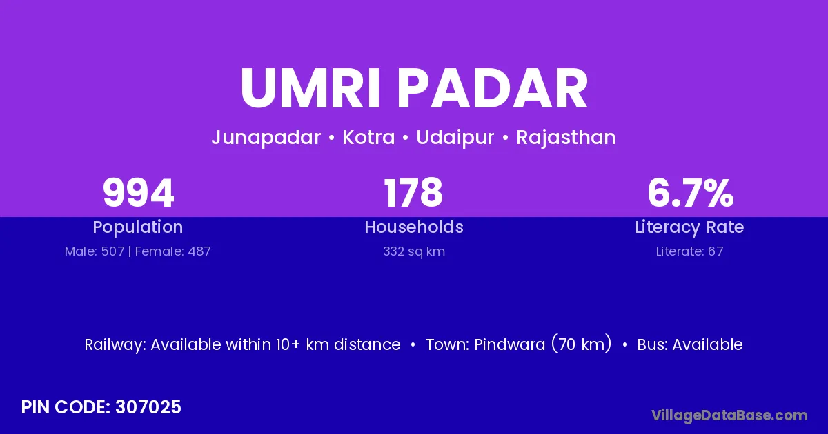 Pindwara (70 km) is the nearest town to Umri Padar village for major economic activities and is located approximately 70 km away.