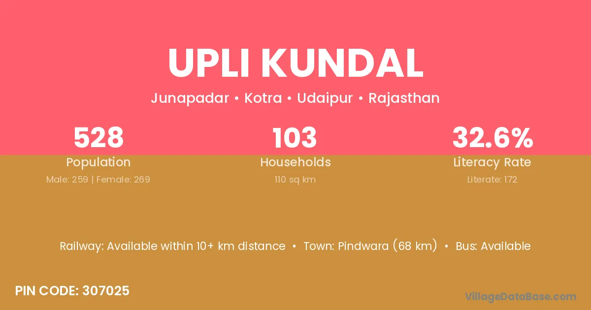 Pindwara (68 km) is the nearest town to Upli Kundal village for major economic activities and is located approximately 68 km away.