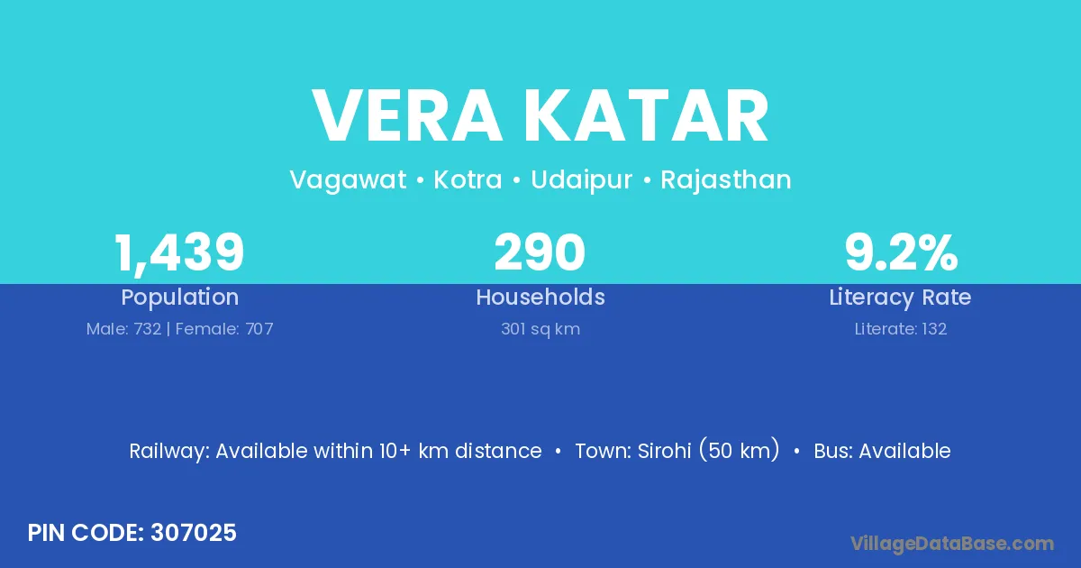 Sirohi (50 km) is the nearest town to Vera Katar village for major economic activities and is located approximately 50 km away.