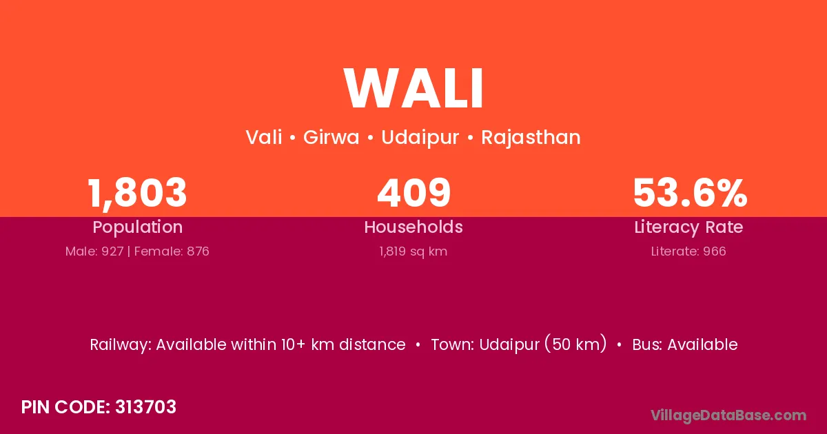 Udaipur (134 km) is the nearest town to Wali village for major economic activities and is located approximately 134 km away.