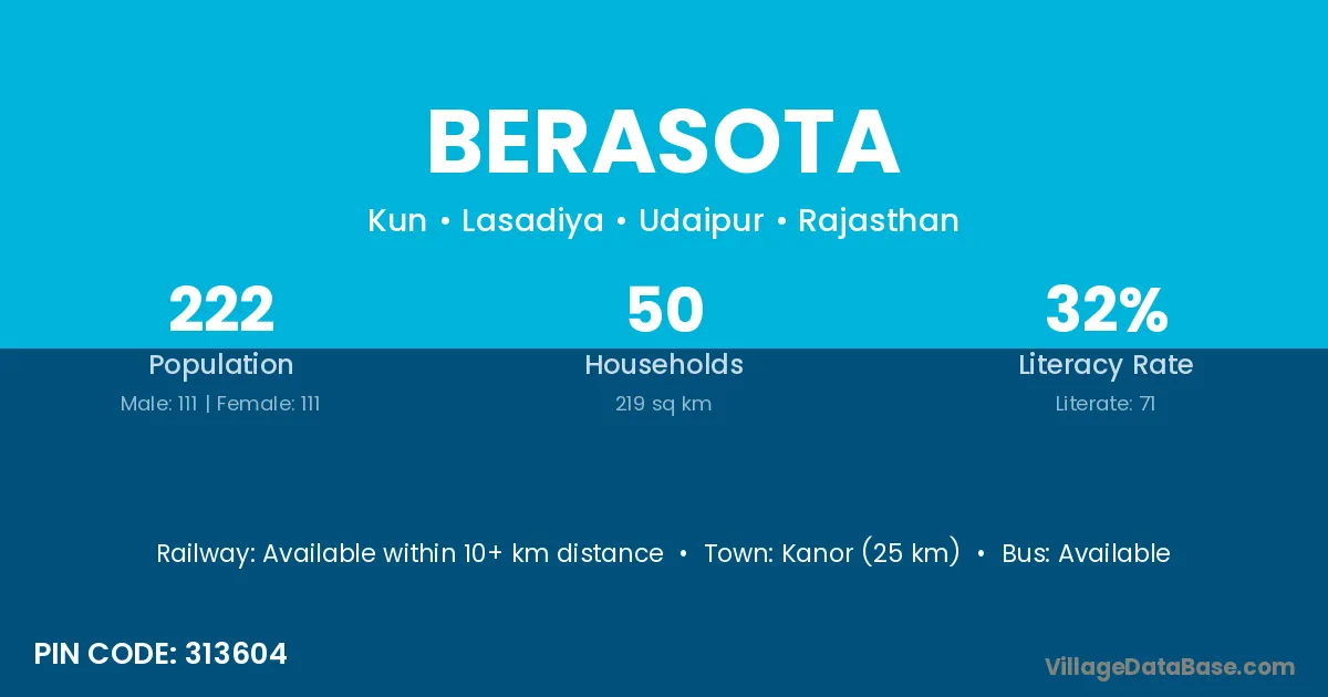Kanor (25 km) is the nearest town to Berasota village for major economic activities and is located approximately 25 km away.