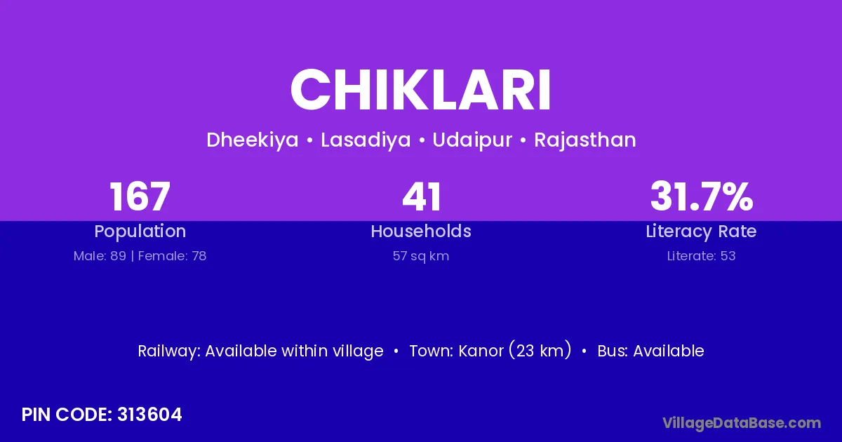 Kanor (23 km) is the nearest town to Chiklari village for major economic activities and is located approximately 23 km away.