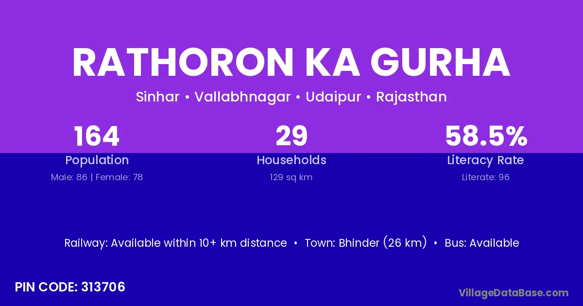 Rathoron Ka Gurha village has a total population of 584 people, of which 292 are males and 292 are females.