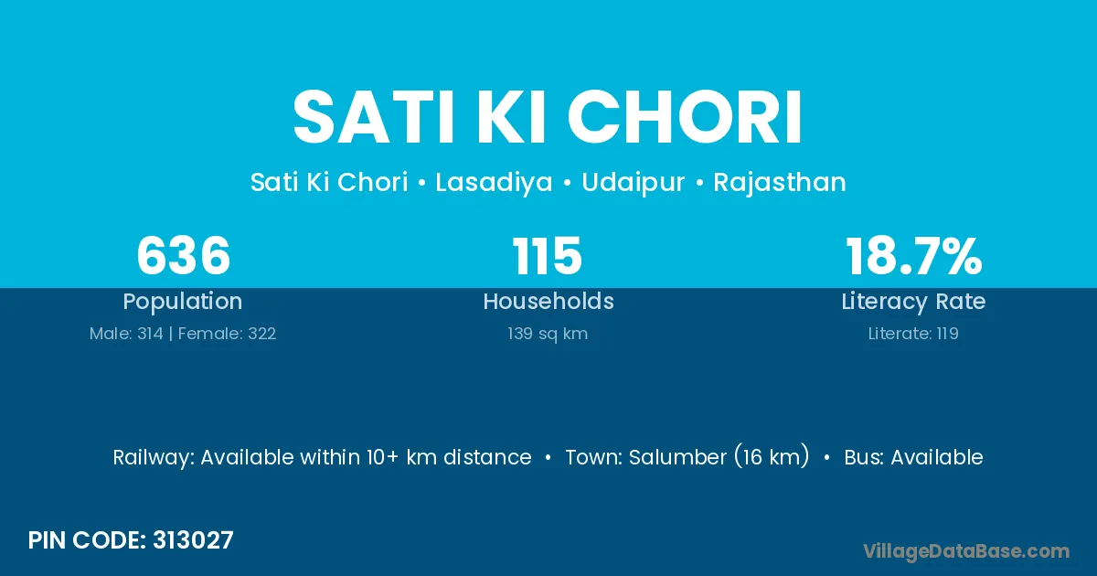 Salumber (16 km) is the nearest town to Sati Ki Chori village for major economic activities and is located approximately 16 km away.