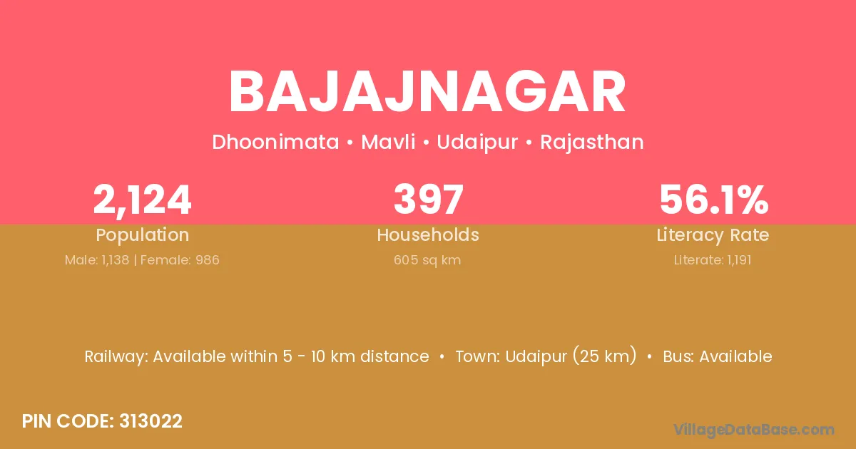 Udaipur (25 km) is the nearest town to Bajajnagar village for major economic activities and is located approximately 25 km away.