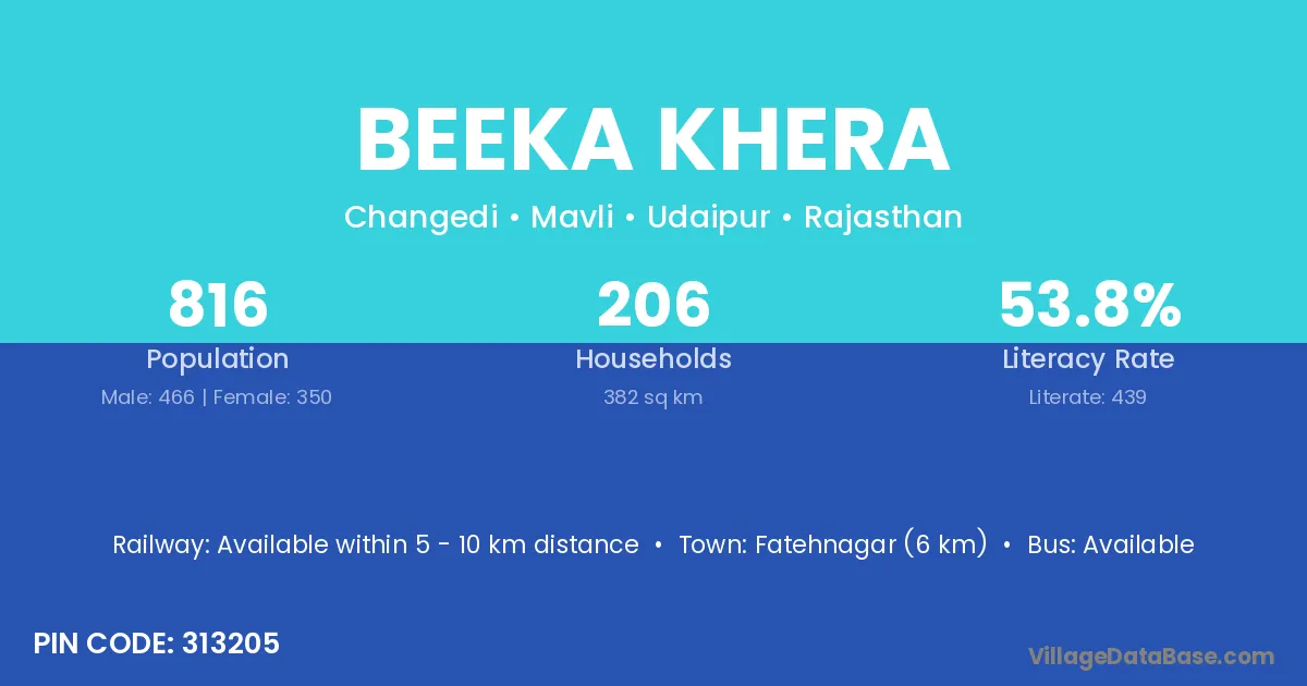 Beeka Khera village has a total population of 816 people, of which 466 are males and 350 are females.