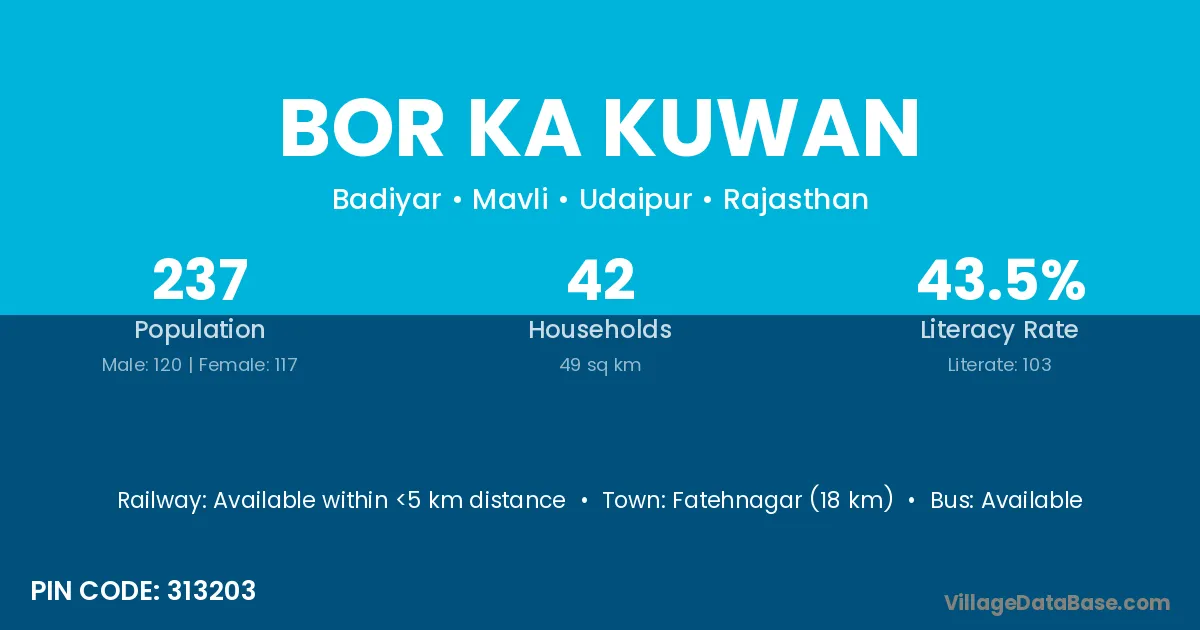 Fatehnagar (18 km) is the nearest town to Bor Ka Kuwan village for major economic activities and is located approximately 18 km away.