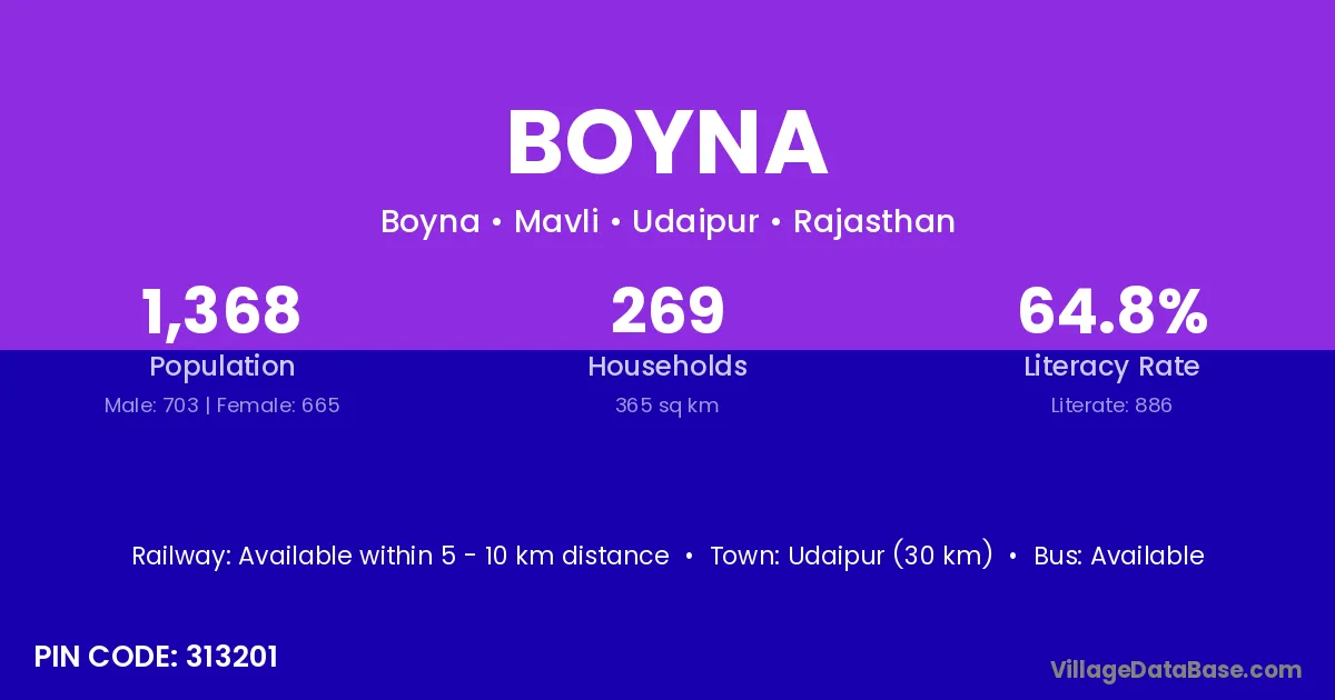 Udaipur (30 km) is the nearest town to Boyna village for major economic activities and is located approximately 30 km away.