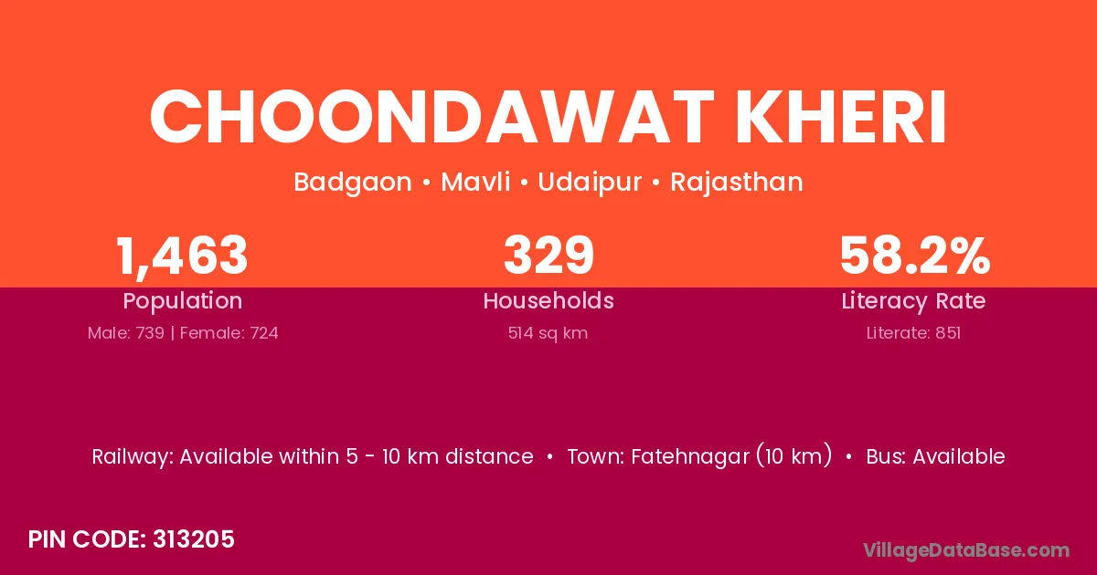 Choondawat Kheri village has a total population of 1,463 people, of which 739 are males and 724 are females.